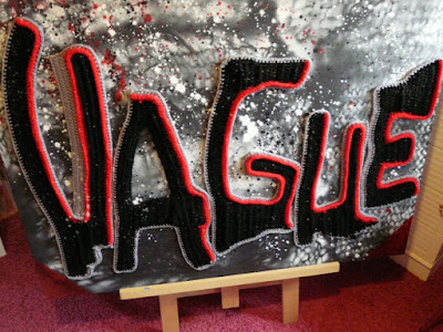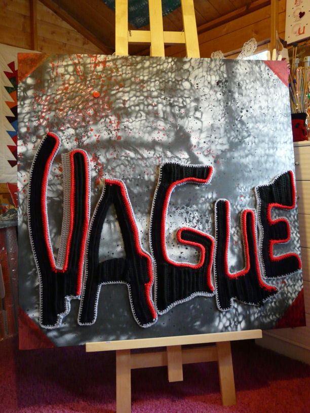 Fourth canvas in my returning home dark compilation of feelings, if this where Star Wars it would be the Dark side art the type Darth Vader would have had in his board room. This time I'm using the letters in different way, actually stitching them to the canvas.
